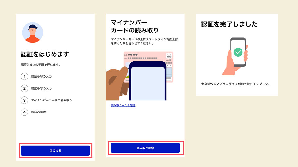 暗証番号2つを入力し、マイナンバーカードを読み取れば認証が完了します。