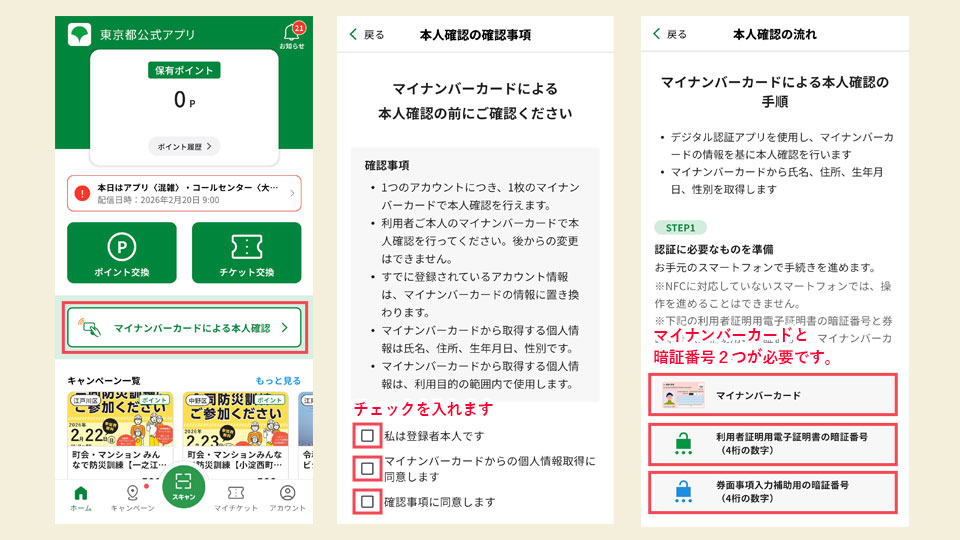 東京アプリを開くと、下のトップ画面が表示されます。赤枠の「マイナンバーカードによる本人確認」のボタンをクリックします。確認事項に全てチェックを入れ、マイナンバーカードと暗証番号2つを用意します。