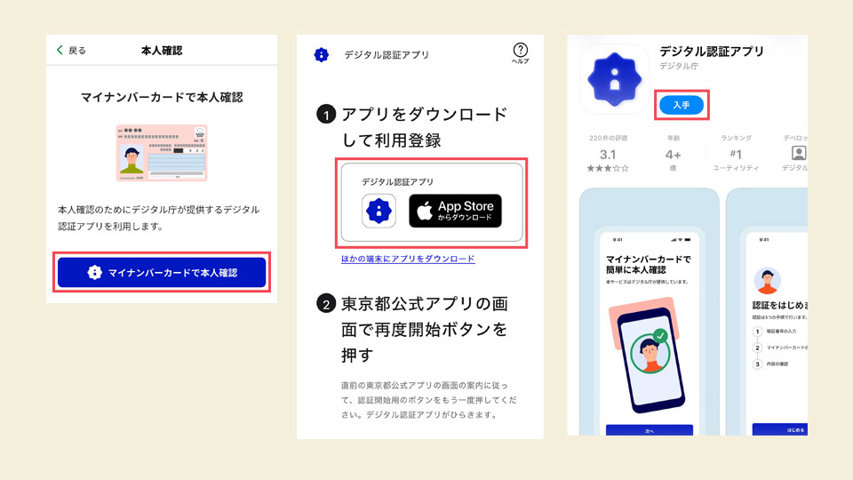 マイナンバーカードで本人確認をするために「デジタル認証アプリ」をダウンロードする必要があります。