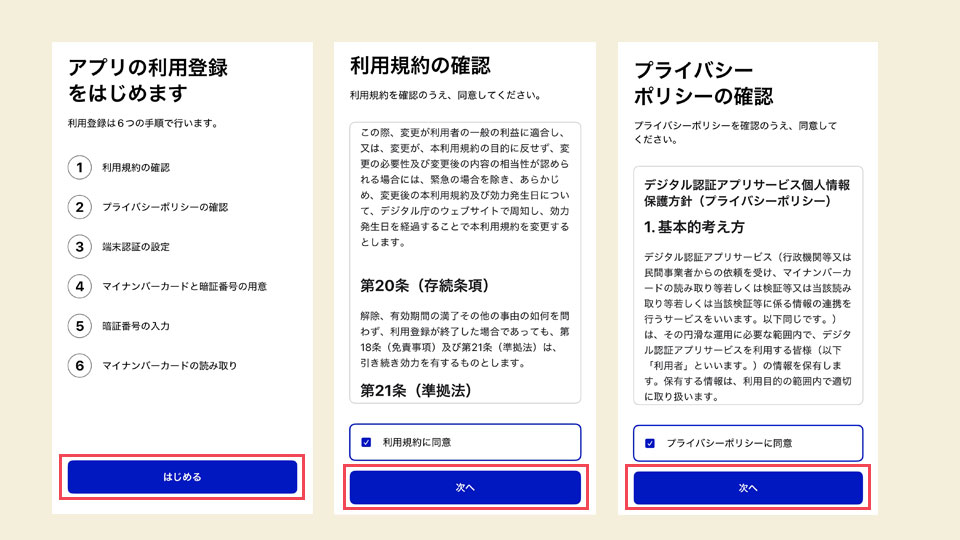 デジタル認証アプリの使用にあたり、各種同意にチェックを入れて次に進みます。